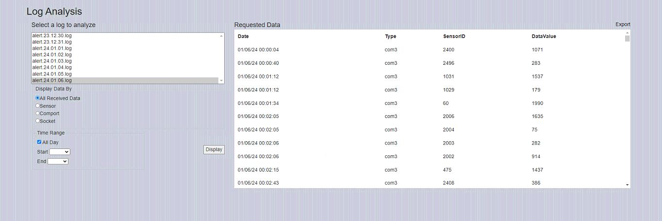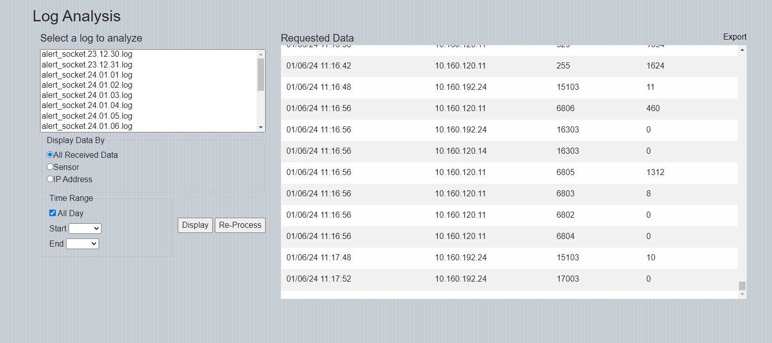 Logs of all received Legacy ALERT data are kept for a period of 7 days (this time period can be adjusted). Display the list by selecting "Analyze ALERT Log" from the "Tabular Data" drop-down menu. Displays similar to those below will be shown