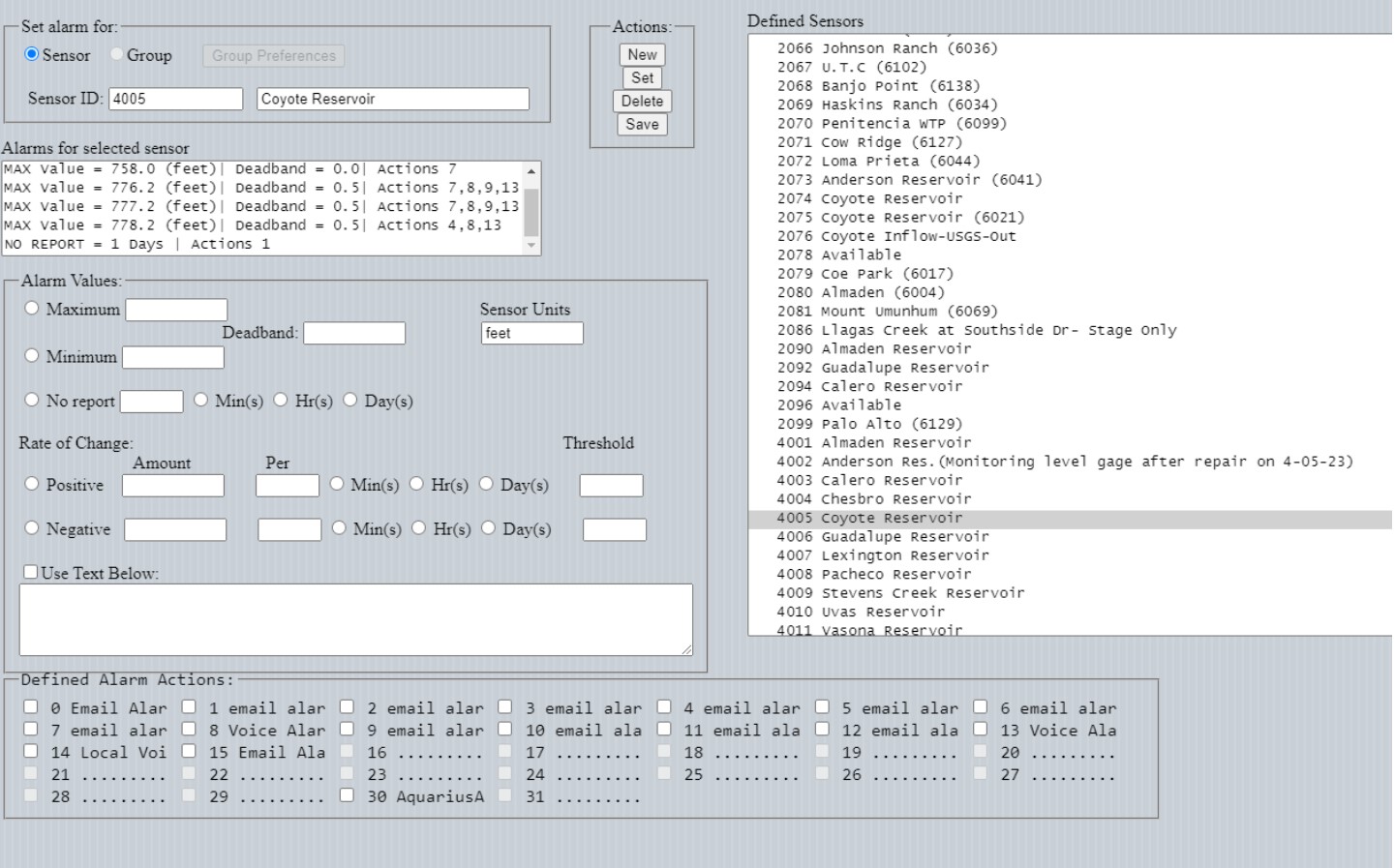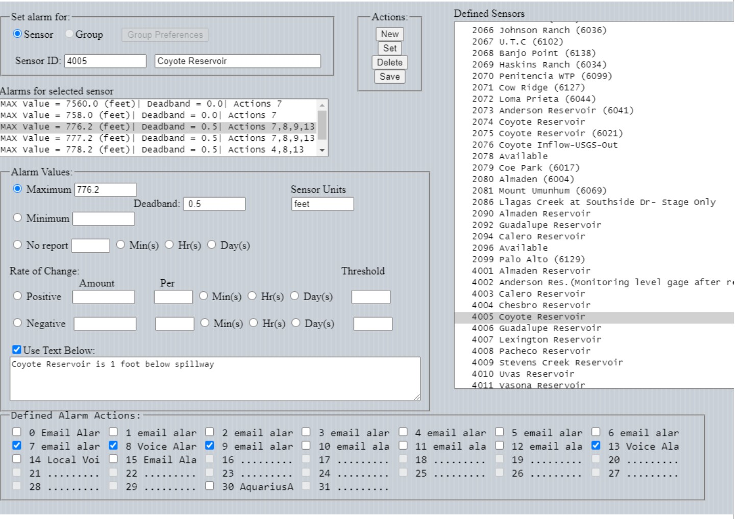 Currently, up to 100 alarm conditions can be defined for each sensor. Additionally, as many alarm actions as have been defined can be selected for any defined alarm.