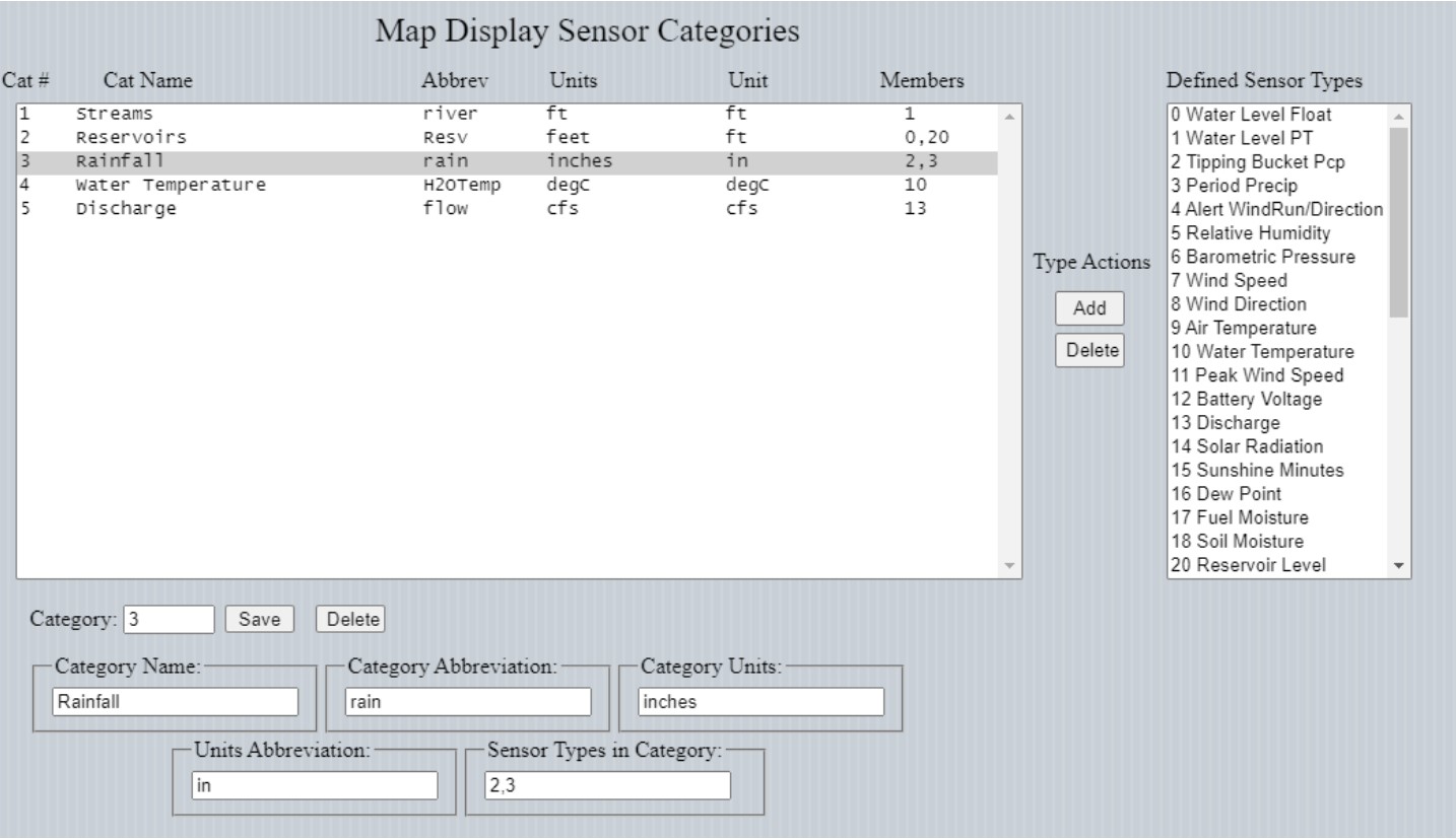 For example, there may be times when two types of rainfall measurements are taken in a telemetry system, accumulating rainfall (e.g., tipping bucket) and incremental rainfall in which the telemetered data reports 15-minute or hourly rainfall amounts. By defining a rainfall category containing both types of rainfall sensors, the data for both types can be displayed on the map.