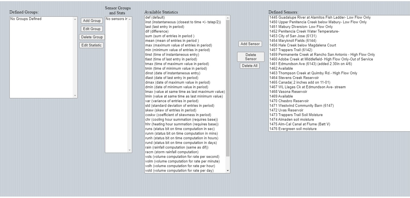 Use the "Add Group", "Edit Group", "Delete Group", and "Edit Statistic" buttons along with the "Add Sensor", "Delete Sensor", and "Delete All" buttons to configure statistical groups. Statistics are defined below: