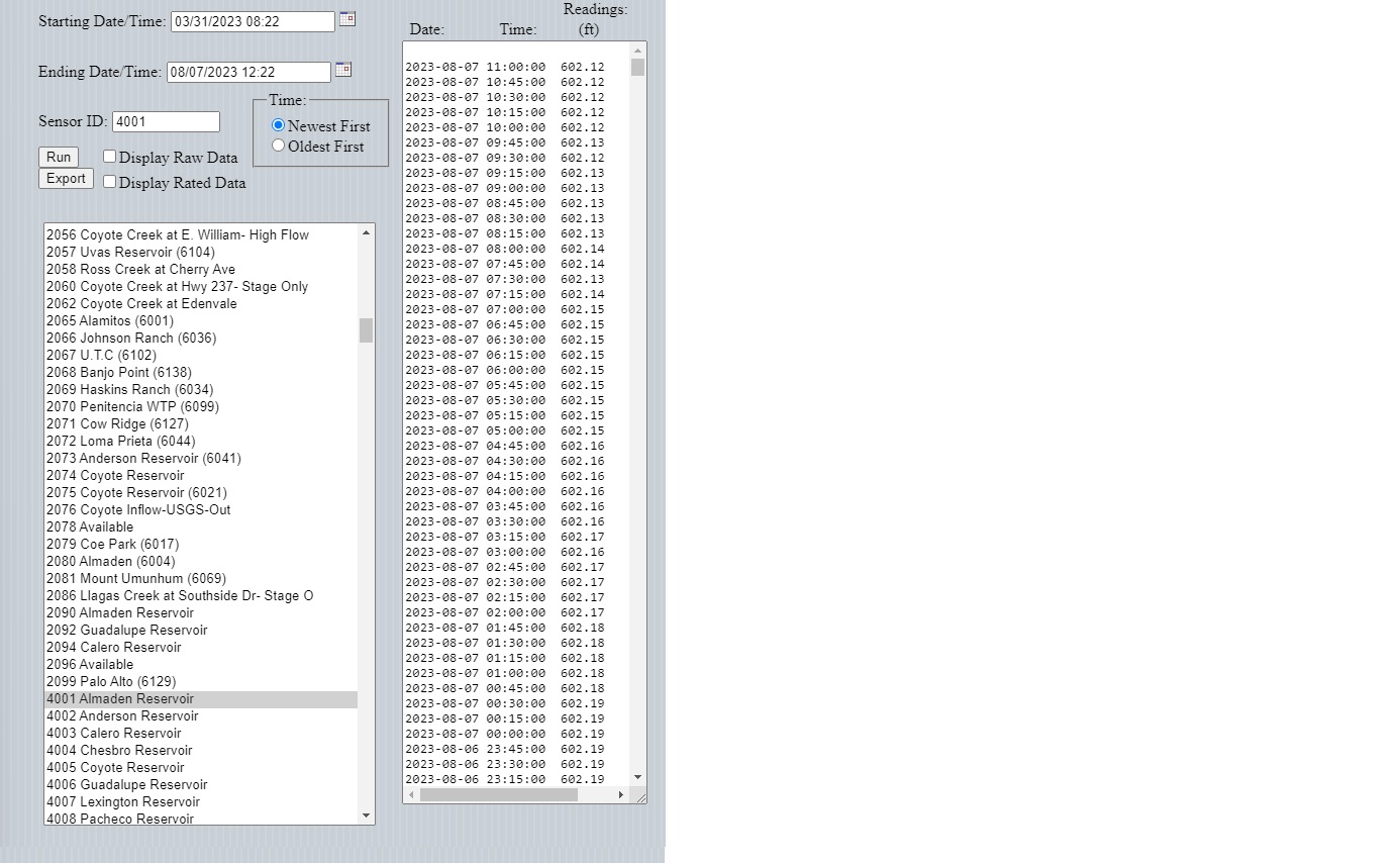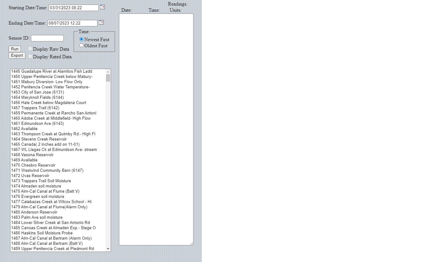 After selecting the desired sensor, starting, and ending dates, clicking on the "Run" button will produce the following output: