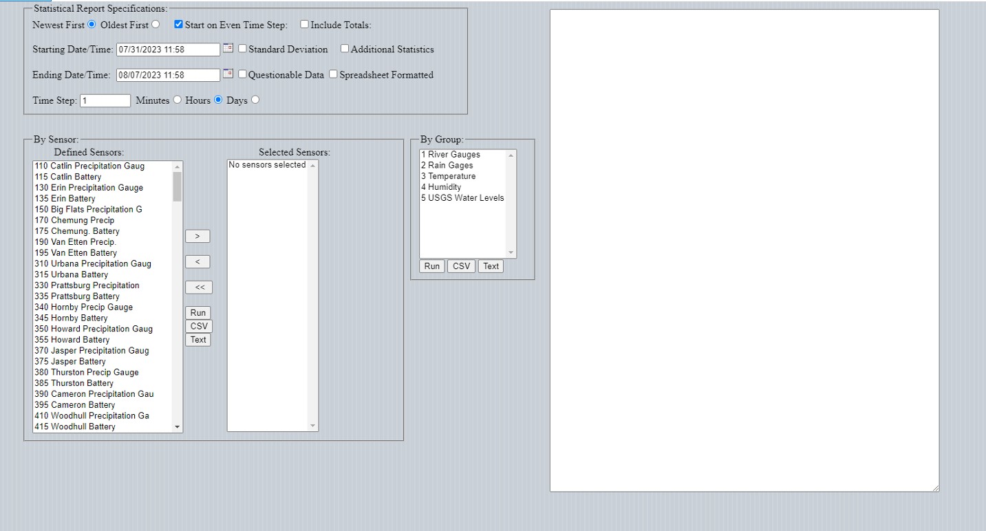 Ad hoc reports can be generated by selecting as many sensors from the "Defined Sensors:" list (clicking the > button after each selected) and then clicking on the desired "Run", "CSV", or "Text" button.