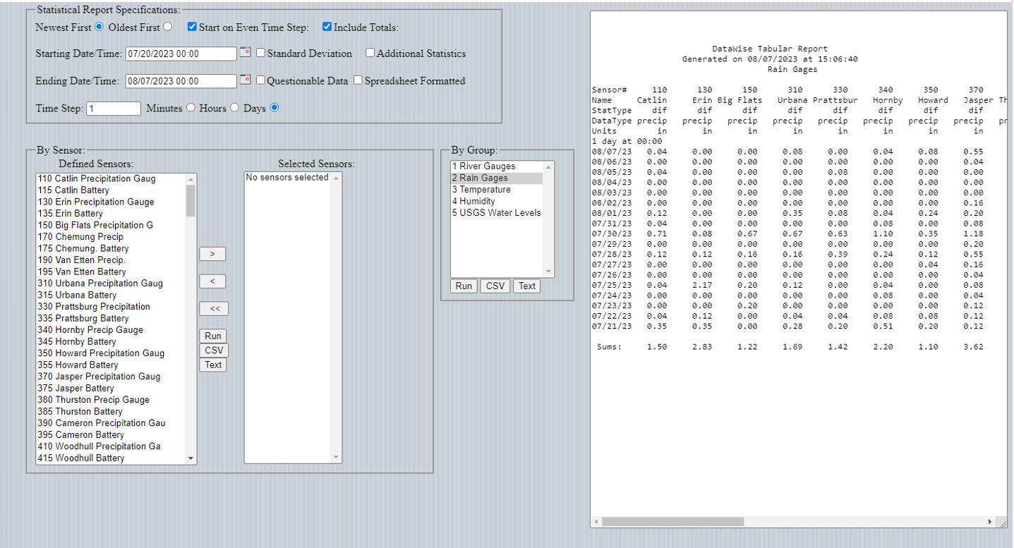 Selecting the rainfall group with the include totals checked and clicking the "Run" button under the "By Group" list produces the report shown below:
