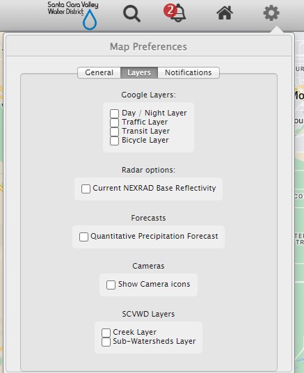 To display Web Cam Icons on the map, click on the "gear" in the upper left corner, click on "Layers", and check the "Show Camera Icons"
